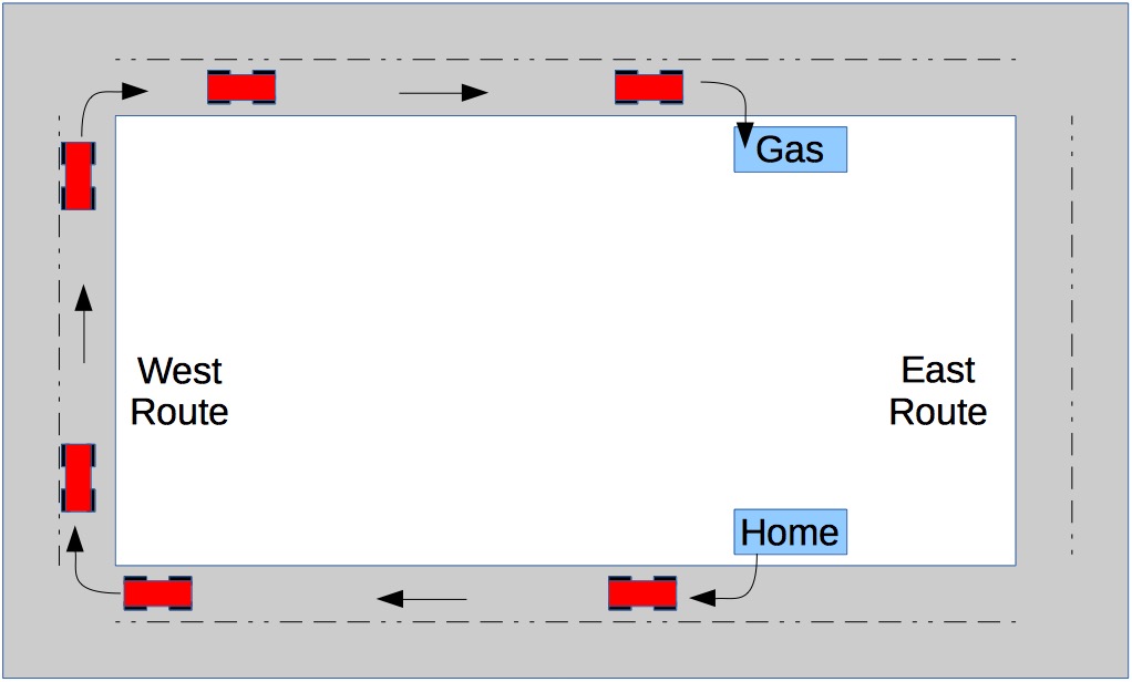 I have two different routes I can drive to get from my house to my local gas station, shown here: