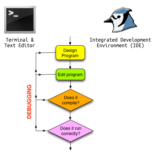 Whether using a text editor/terminal or a more sophisticated IDE, the coding process is identical: