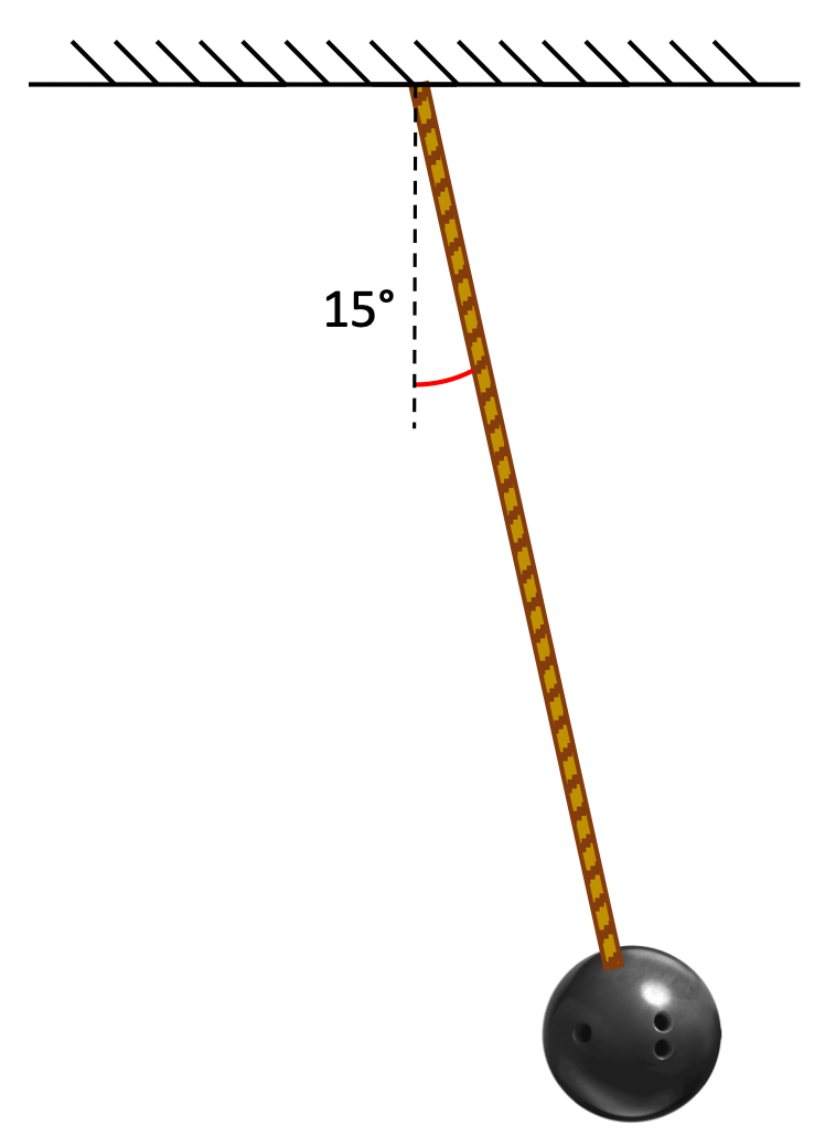 A bowling ball pendulum is tied to the end of a string 3.00 m in length, and allowed to swing in a vertical arc under the influence of gravity. When the hanging ball is swinging up (counterclockwise in the image shown), it makes an angle of 15.0° with the vertical and has a speed of 2.00 m/s.