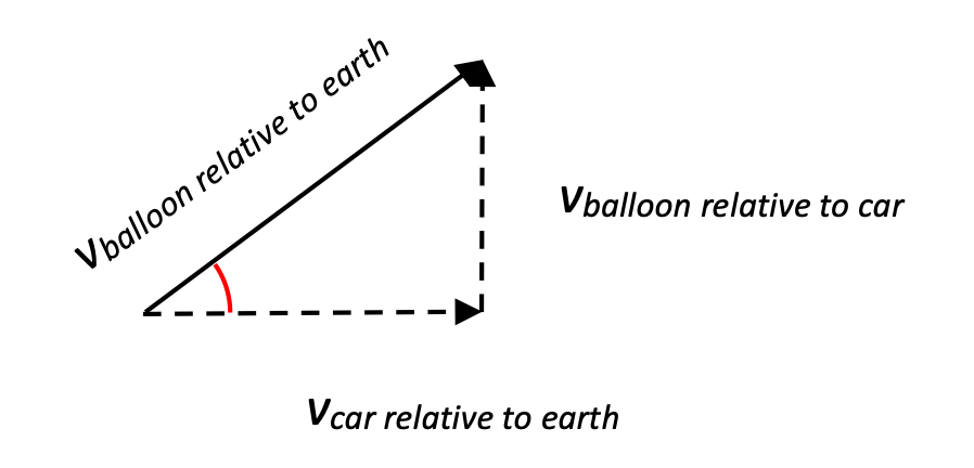 The idea of relative motion can occur in more than one dimension, of course. What if the student, traveling in a car that is moving at +10î m/s (in the positive-x direction), throws the balloon out the window at +5ĵ m/s (in the positive-y direction)? We can't just add the two velocities together as magnitudes because they aren't in the same direction.