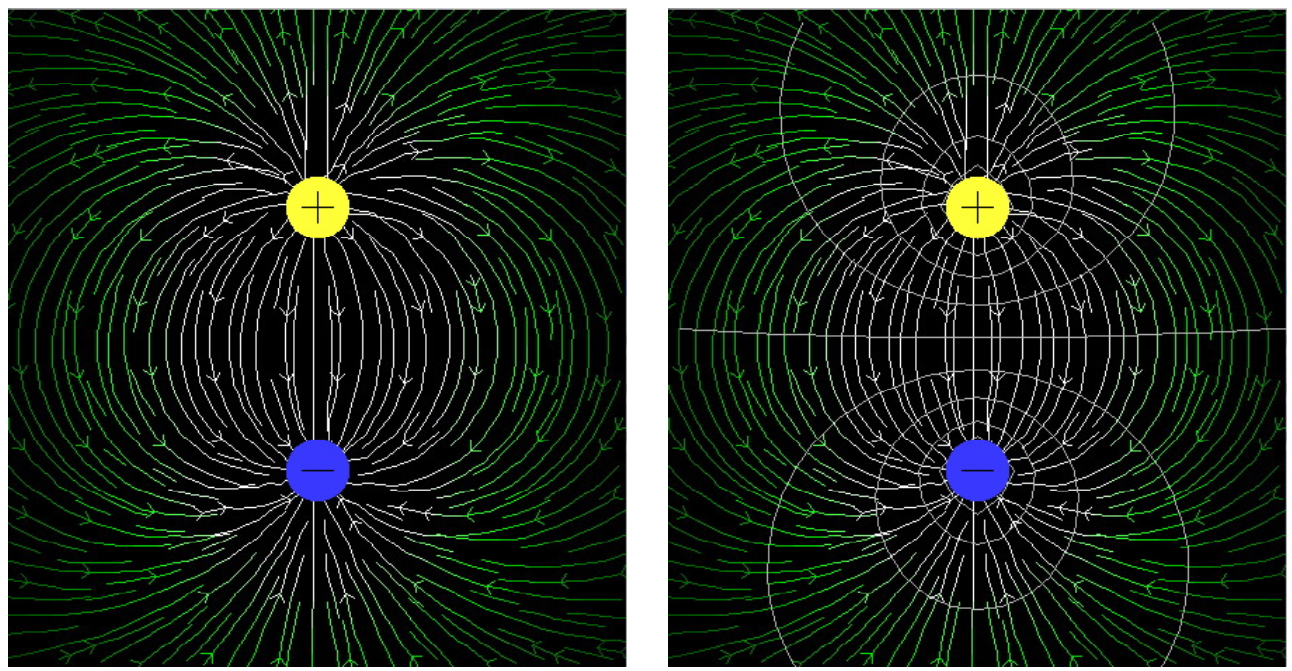 Take a look at the drawings here of equipotentials and field lines. What is the relationship between the orientation of the field lines and the orientation of the equipotentials?