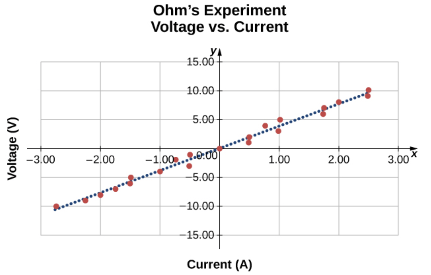 By graphing potential V vs current I for a range of values, Ohm determined a constant relationship for a given length of wire (with a fixed resistance):
