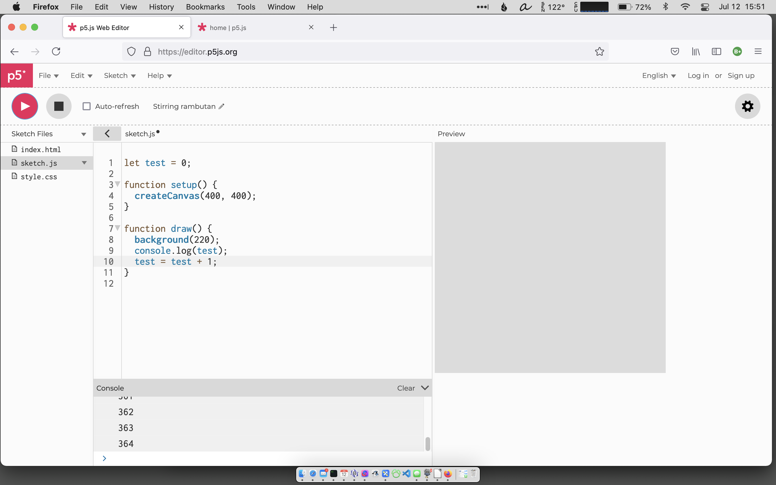 Add three lines to your sketch as shown in the screenshot here. Then click the "Play" button. You should see the value of test repeatedly printed out in the Console, confirming that the draw() function is being repeatedly run, over and over again.